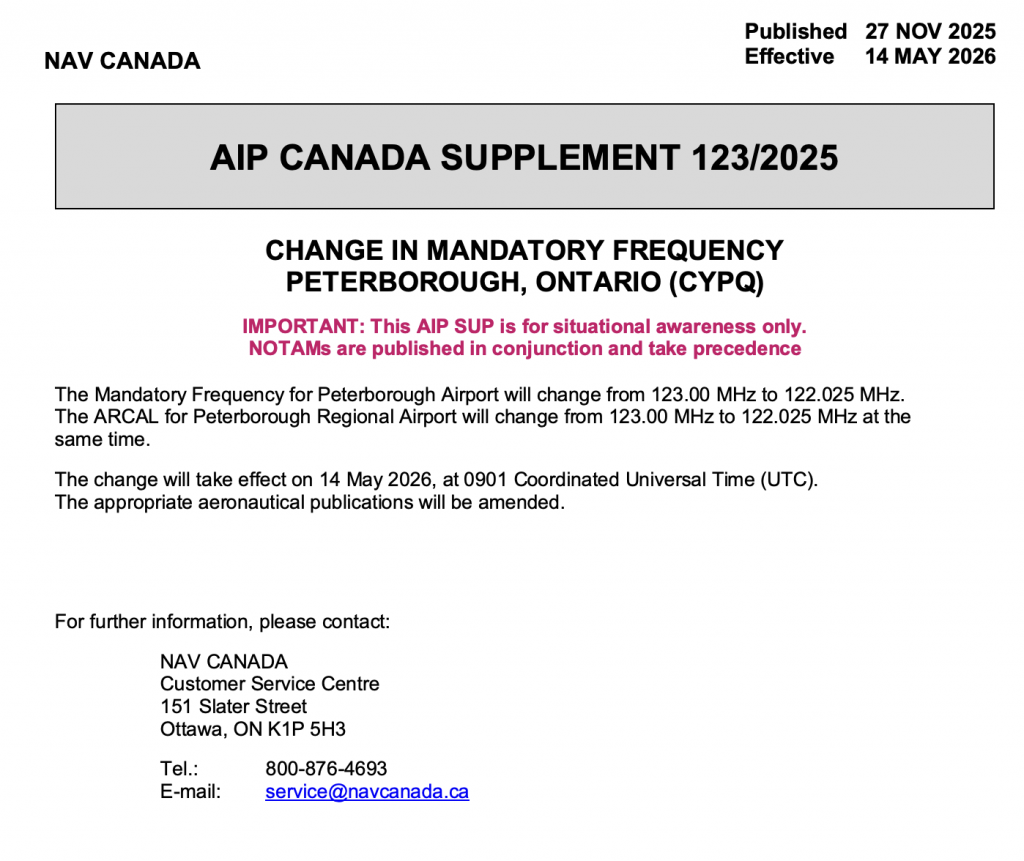 CHANGE IN MANDATORY FREQUENCY PETERBOROUGH, ONTARIO (CYPQ)